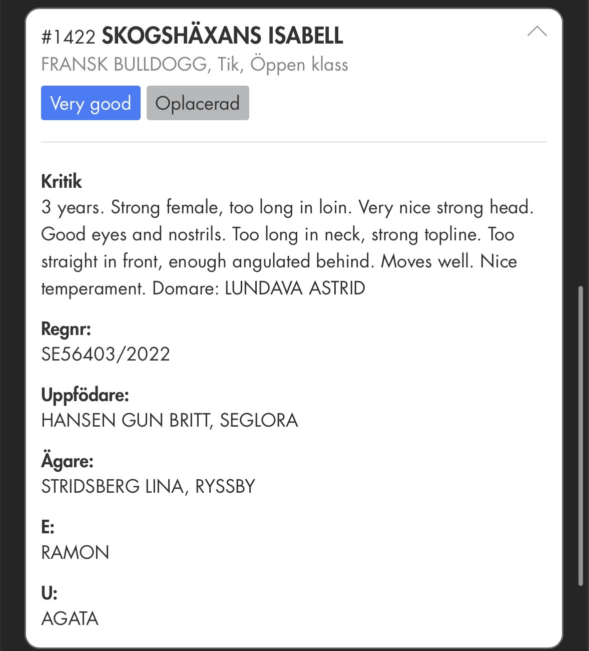 Hur många placeringar en hund har fått på utställningar säger ingenting om hur frisk hunden är, på utställning bedöms endast hur väl hunden stämmer överens med den aktuella rasstandarden enligt domarens preferenser.